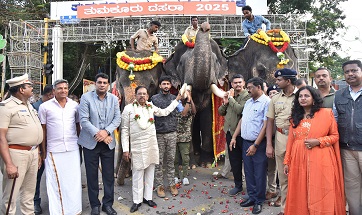 ವಿಜಯದಶಮಿಯಂದು ಜರುಗುವ ಜಂಬೂ ಸವಾರಿ ಮೆರವಣಿಗೆಯಲ್ಲಿ ಪಾಲ್ಗೊಳ್ಳುವ ಶ್ರೀರಾಮ, ನೊಣವಿನಕೆರೆಯ ಲಕ್ಷ್ಮಿ ಹಾಗೂ ಕರಿಬಸವೇಶ್ವರ ಮಠದ ಲಕ್ಷ್ಮಿ ಸೇರಿದಂತೆ 3 ಆನೆಗಳಿಗೆ ನಗರದ ಬಿ.ಜಿ.ಎಸ್. ವೃತ್ತದ ಬಳಿ ಸಚಿವರು ಪೂಜೆ ಸಲ್ಲಿಸಿದರು.