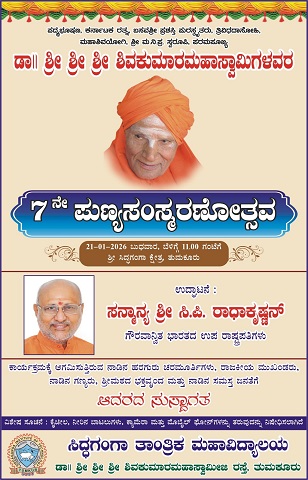 ತುಮಕೂರು : ಸಿದ್ದಗಂಗಾ ಮಠದ ಡಾ.ಶ್ರೀ ಶಿವಕುಮಾರಸ್ವಾಮಿಗಳ 7ನೇ ವರ್ಷದ ಪುಣ್ಯಸ್ಮರಣೆಯನ್ನು ಜನವರಿ 21ರ ಬುಧವಾರ 11 ಗಂಟೆಗೆ ಹಮ್ಮಿಕೊಳ್ಳಲಾಗಿದ್ದು, ಪುಣ್ಯಸ್ಮರಣೆಯ ಕಾರ್ಯಕ್ರಮವನ್ನು ಉಪ ರಾಷ್ಟ್ರಪತಿ ಸಿ.ಪಿ.ರಾಧಕೃಷ್ಣನ್ ಉದ್ಘಾಟಿಸಲಿದ್ದಾರೆಂದು ಆಡಳಿತಾಧಿಕಾರಿ ಜಯವಿಭವ ಸ್ವಾಮಿ ತಿಳಿಸಿದರು.