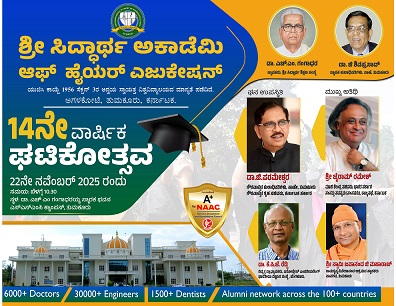 ಕಾರ್ಯಕ್ರಮ: ಶ್ರೀ ಸಿದ್ಧಾರ್ಥ ವೈದ್ಯಕೀಯ ಕಾಲೇಜಿನ ಹೆಚ್.ಎಮ್.ಗಂಗಾಧರಯ್ಯ ಸ್ಮಾರಕ ಭವನದಲ್ಲಿ ಶನಿವಾರ (ನವೆಂಬರ್ 22ರಂದು) ಬೆಳಿಗ್ಗೆ 10-30ಕ್ಕೆ ಸಾಹೇ (ಶ್ರೀ ಸಿದ್ಧಾರ್ಥ ಆಕಾಡೆಮಿ ಆಫ್ ಹೈಯರ್ ಎಜುಕೇಷನ್) ವಿಶ್ವವಿದ್ಯಾಲಯದ 14 ನೇ ಘಟಿಕೋತ್ಸವ ಆಯೋಜಿಸಲಾಗಿದೆ.